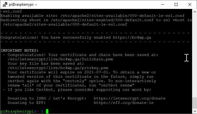 Certbot is a free option to install an SSL certificate. I found instructions for the setup process here. As with the WP setup, it's probably best to follow the steps in that linked guide, but here is a quick summary. SSH into the Pi and type the following commands: