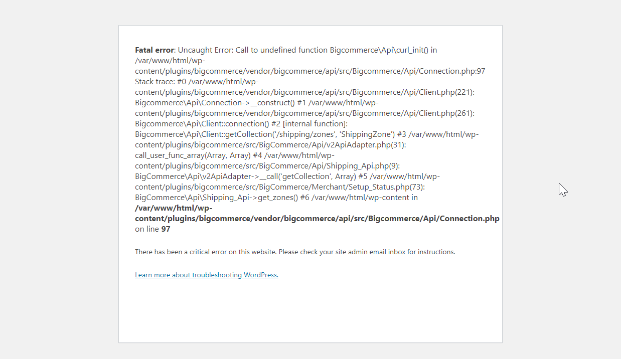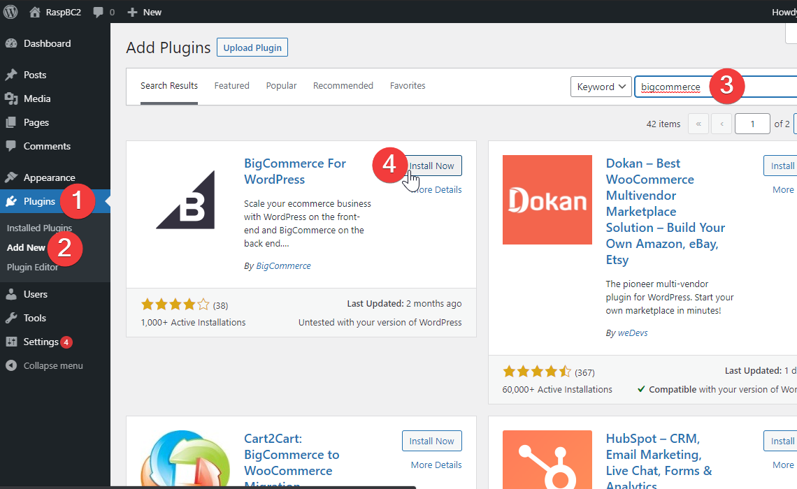 At this point, the hard stuff was out of the way (so I thought) and I could let the plugin's easy automatic setup handle the heavy lifting from here. I navigated to Plugins > Add New, and searched for "bigcommerce". I clicked to install the plugin.