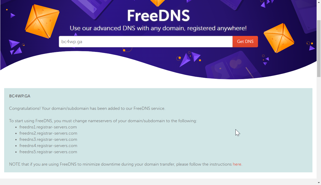 Those nameservers set up in the last step won't do anything if the DNS is not set up at the Namecheap servers, so I then set up the Namecheap account. After signing up for the free account, I navigated to Domains > FreeDNS and searched for my newly acquired domain. It showed the option to get DNS for that domain for free. After registering the domain in Namecheap, this confirmation screen lists the domain name servers I already took care of in the previous step: