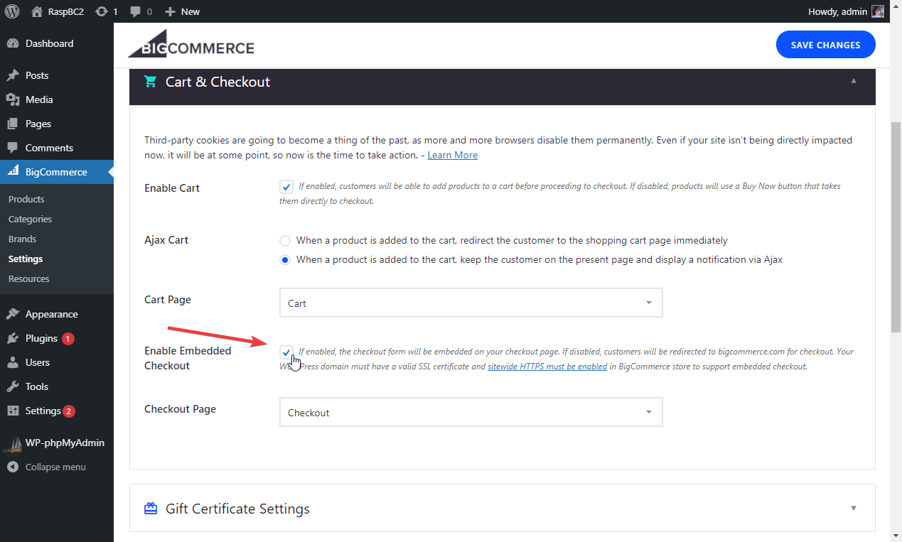 The final step was to enable embedded checkout. Since I'd set the main domain to WP and the subdomain to BC correctly, I could go ahead and safely enable embedded checkout here: