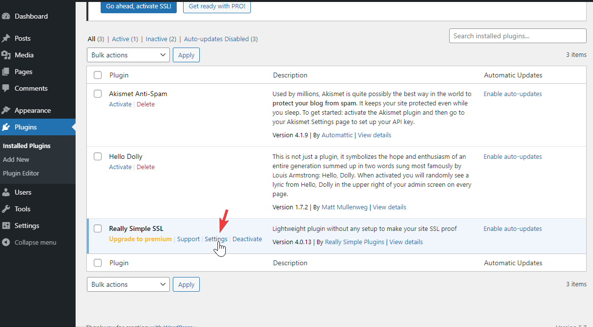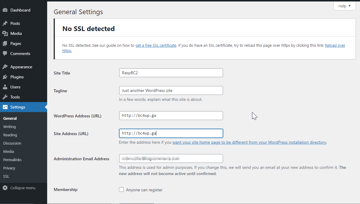 Now that the SSL was ready, I logged in to WP dashboard and navigated to Settings > General, and made sure the URLs were set properly. I set them to the http version first, since it's not yet configured to use SSL. If you set these URLs to use https before it's set up, it may cause access problems since it will try to serve the control panel and storefront over https but won't be able to. The plugin in the next couple of steps will take care of that though.