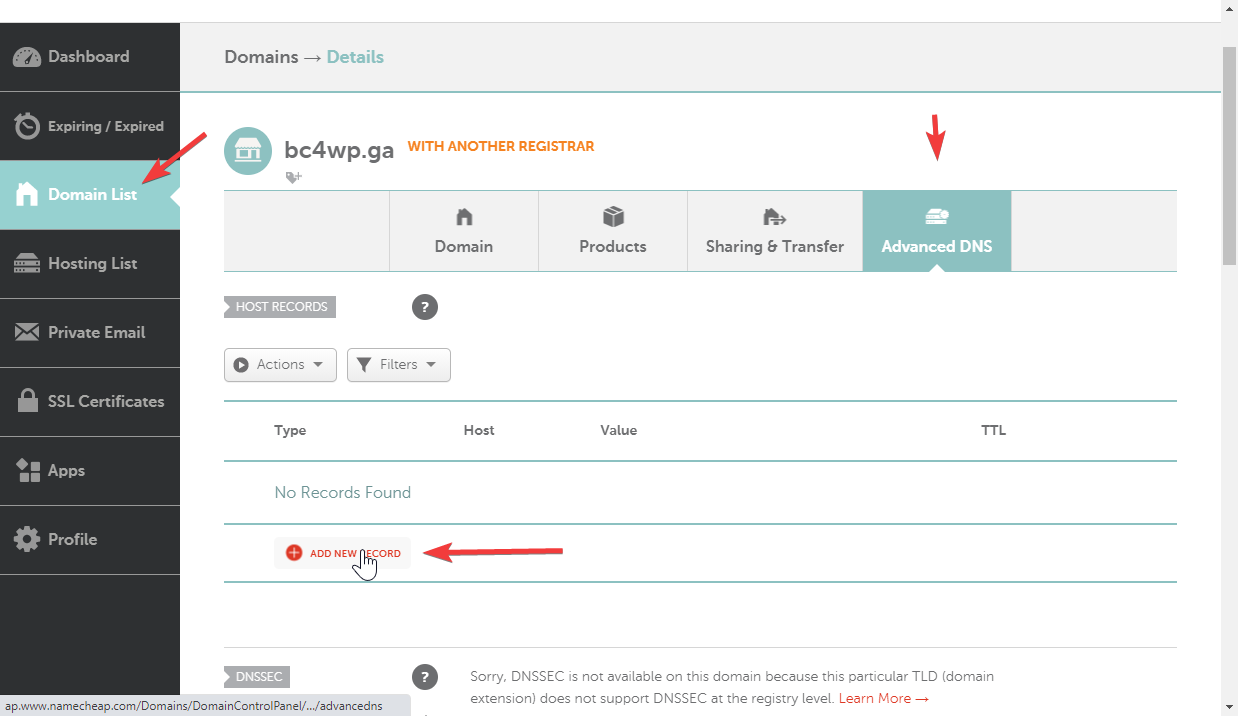 I then navigated to my Namecheap dashboard, clicked "Manage" by the domain I just added, and went to the Advanced DNS section, where I added my DNS records: