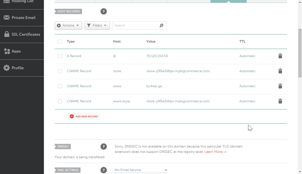 Since I intended to use BC4WP's embedded checkout feature, I also added a CNAME record that points a subdomain to my BC store. Having the BC store at [subdomain].bc4wp.ga will allow the embedded checkout to receive requests without triggering any cross domain errors that some browsers have issues with. Namecheap doesn't require the full domain/subdomain for the host field, so I just entered "store" for the host and my BC canonical URL for the value. I also added www CNAME records to both root domain and the BC subdomain. I ended up with 4 DNS records: