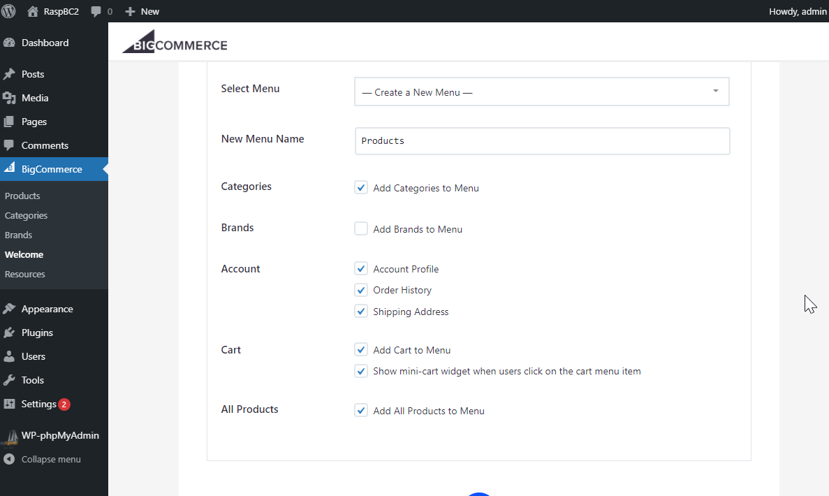 At this point the plugin was activated. I clicked "get started" in plugin main screen. I walked through steps, logging in to my store as the owner account. When asked how I wanted to use BC4WP, I selected "full featured store" I set up menus to include everything except Brands. No particular reason, I just often don't assign brands to my test products.