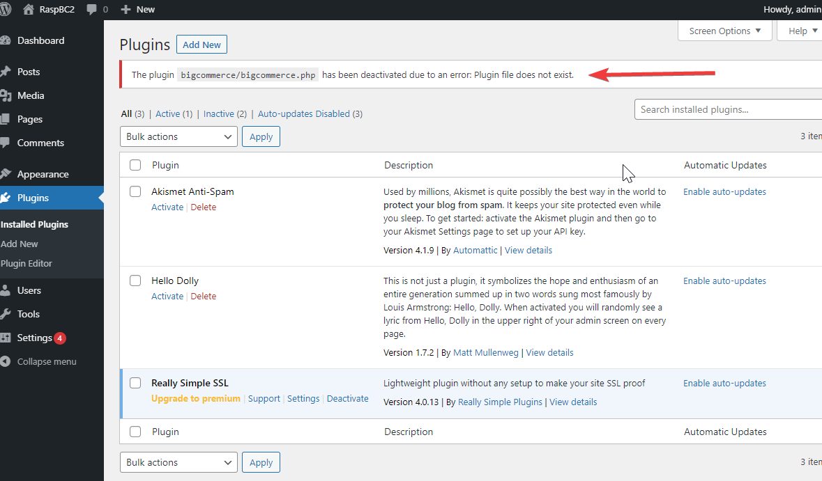 I tried to navigate back to the plugins page, but I got the same error. I then tried to get back to the login page, same error. Oh no! The site was completely broken! Not a big deal though. I used SSH to get back into the Pi, and navigated to the plugins folder: