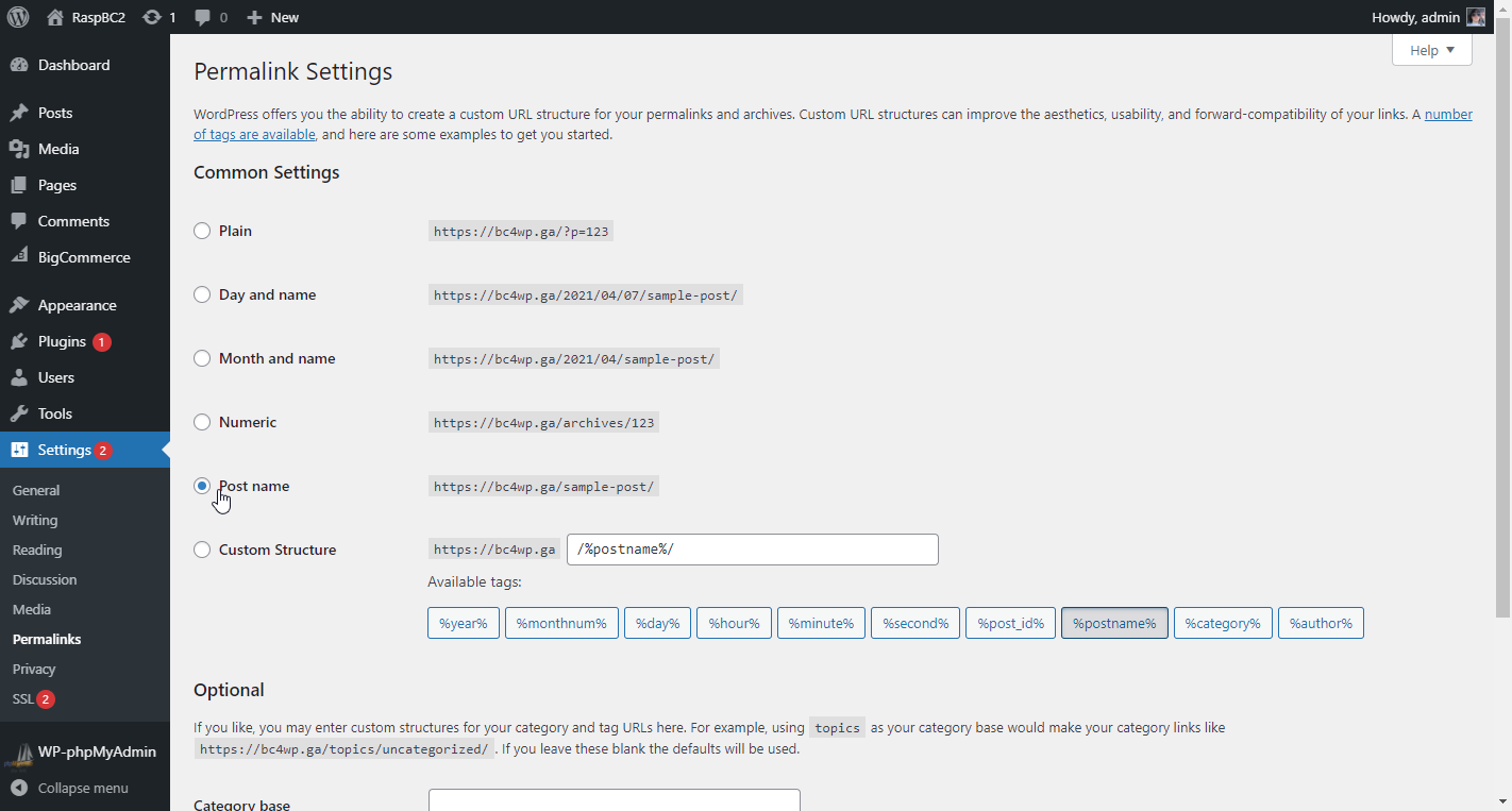 I navigated to my local IP address and followed the on-screen instructions. Again, refer to the linked walkthrough if necessary. Per the walkthrough, I set the permalink settings to "Post Name" at Settings > Permalinks.